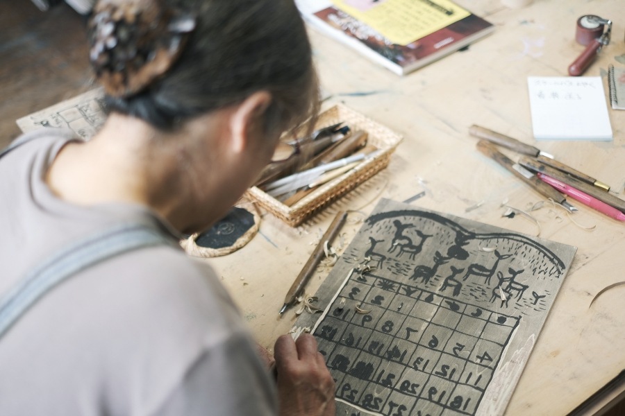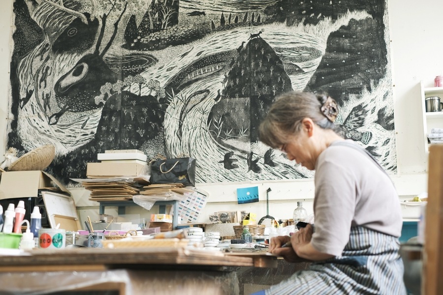 いきいきとした植物や動物、鮮やかながらも落ち着いた色づかい。「版画」と聞いて思い浮かぶのは板をゴリゴリと彫る音や刷り上がった線の強弱といった力強いイメージでしたが、こだまみわこさんの作品を見たときに感じたのは、のびのびとした柔らかさでした。