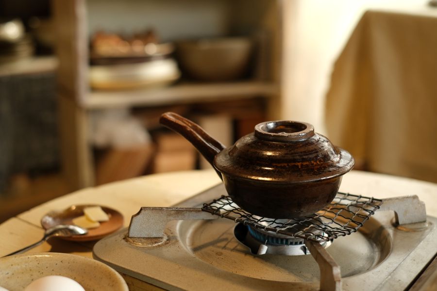 愛媛時代に作ったエッグベーカーを、30年以上使い続けているという松浦さん。長持ちのコツは、「最初の23回は、弱火で油分を丁寧に馴染ませながら使うこと。洗った後はよく乾かすこと」の2つ。お手入れに関しても基本的には、「土鍋と同じ」。通常の食器用洗剤やスポンジで洗うことができます。食器洗浄機やIHクッキングヒーターでの使用はできませんので、ご注意ください。また、ガスコンロの五徳のサイズによっては付属の焼き網を置いて使うのがおすすめです。