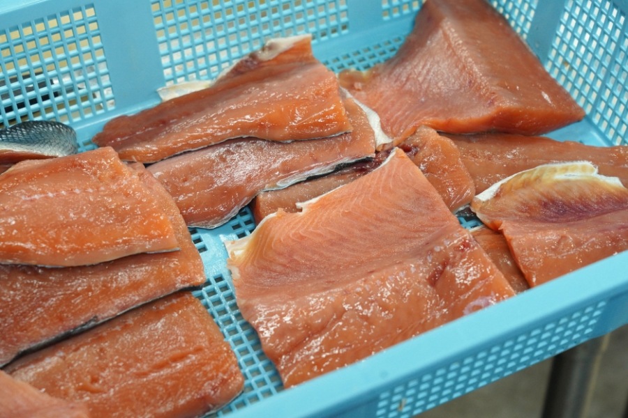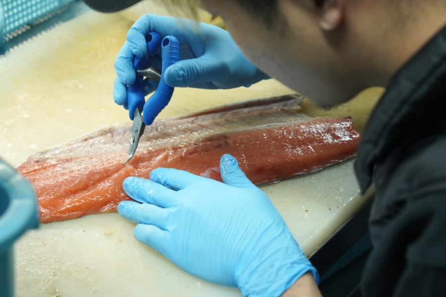 「ルイベは鮭を賽の目状に細かく切るため、手間がかかるからか、大きな加工場ではあまり手がけていない商品だと思います。鮭もいくらも、水揚げしたものをその日のうちに加工できるのは漁師直営ならではです」。さらに、圓子水産の自慢は漁師としての「目利き」があること。「ルイベは刺身の一種なので、そのまま食べておいしいレベルの鮭じゃないと駄目なんです。色や厚み、脂の乗りなど、素材選びからこだわっています」。その時々で一番おいしい鮭を選んでおり、白鮭、カラフトマス、サクラマスと使う魚を変えているのだそう。時期によって異なるおいしさが味わえるのもちょっとした楽しみの一つです。