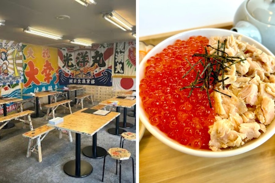 写真上/加工場に併設した食堂。海鮮丼をはじめ、一品料理や焼き物のほか、その日の仕入れや漁の状況により日替わりメニューも登場します。営業日は圓子水産のInstagramでご確認を。
