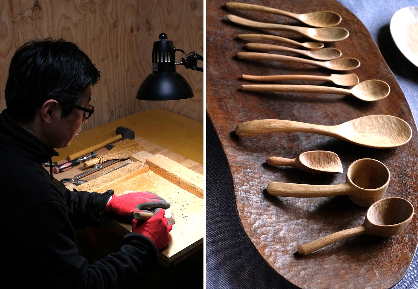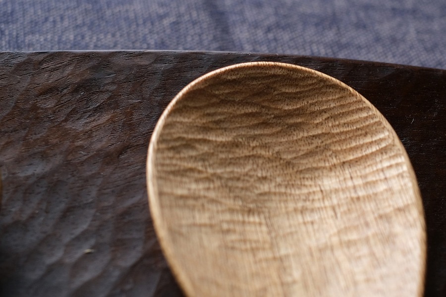 工房の壁面には、天井まで届きそうなほど長い木の板がいくつも立て掛けられています。そこから糸鋸で形を切り出し、旋盤やノミで成型。最後に、全体を覆うように表面に細かな彫り跡を入れるのが特徴です。一度形を作ってからさらに彫りを入れるという二度手間のような作り方は、効率性を考えると「手間がかかりすぎる」とも言えます。ですが、仕上がった器から感じられる独特の温かさや手に取ったときの柔らかさ、カトラリーやカップを口に運んだときの触感の良さは格別です。そしてその「手間」について平子さんに尋ねてみると、「滑らかに仕上げるより、少しデコボコとした質感を残すほうが、作っていて楽しい」とも話してくれました。